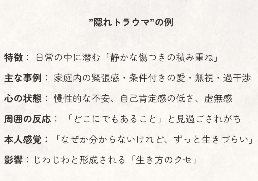 そのことに本人が気づいていないのなら、それは”隠れトラウマ”です。